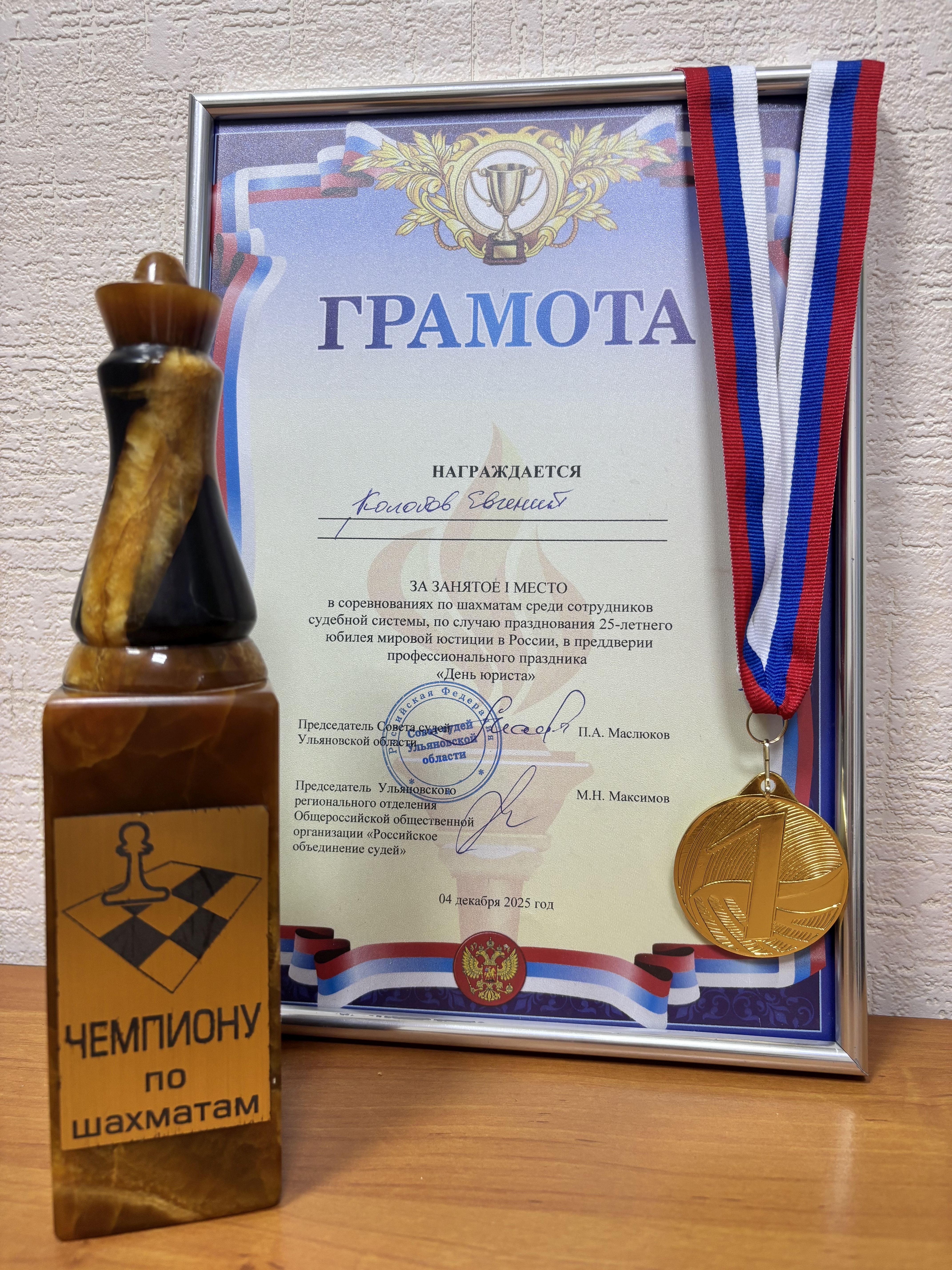 05 декабря 2025 года в Ульяновском областном суде состоялся шахматный турнир. Мероприятие было организовано Советом судей Ульяновской области по случаю празднования 25-летнего юбилея мировой юстиции в России и профессионального праздника – «День юриста». От Заволжского районного суда г. Ульяновска в шахматном турнире принял участие: консультант суда Колобов Евгений Александрович и вновь завоевал высшую награду - 1 место в турнире «Чемпион по шахматам», подтвердив свой невероятный талант и упорство, проявленные в весенней спартакиаде 2025 года.